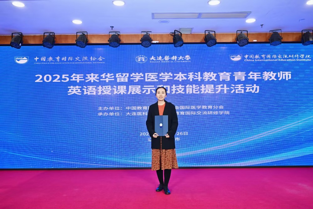 为提升来华留学医学教育师资队伍英语授课能力,推动医学教育国际化高质量发展,2025年10月23日至26日,由中国教育国际交流协会国际医学教育分会主办、大连医科大学与中国教育国际交流研修学院承办的“2025年来华留学医学本科教育青年教师英语授课展示和技能提升活动”在辽宁省大连市成功举办。我校公共卫生学院青年教师杨慧君代表学校参加。