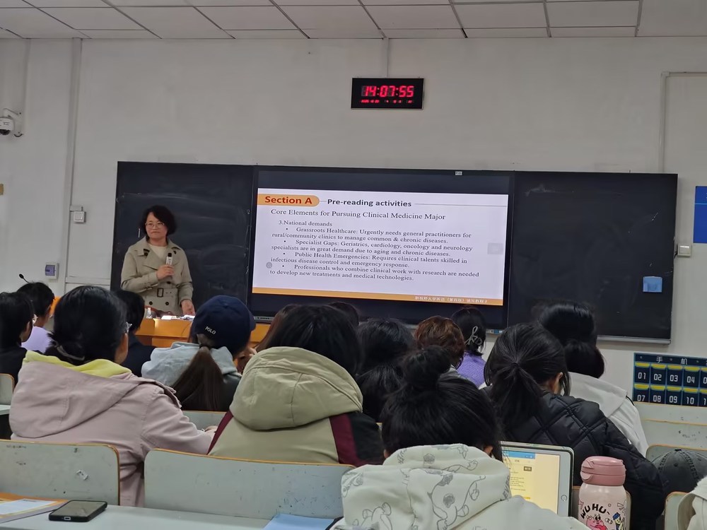 本次观摩课主题为“大学专业选择”。在互动研讨环节,学生围绕选择临床医学专业的初衷展开小组讨论,教师引导学生认识到专业选择需要兼顾个人兴趣、能力特点与国家社会需求,并自然融入医者初心、仁心妙术的职业信念。在课文教学环节,教师通过分析中西方学生专业选择的差异,引入“Individualism and Collectivism”的文化对比,在语言教学中渗透价值引导,体现了专业知识与思政元素的有机融合。